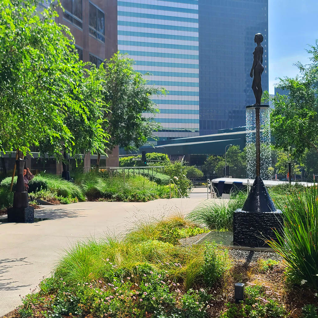 Mantener el agua como parte de las esculturas era importante para el equipo de diseño del proyecto, que también incluía al hijo del difunto artista, Steven Graham, y a la consultora de arte Karen Amiel. Se recurrió a OTL para crear nuevos elementos de agua que integraran las esculturas en el jardín. La nueva huella para las características era más pequeña que las cuencas originales, por lo que Chris, entonces Director de Diseño Creativo de OTL, trabajó estrechamente con Steven, que había creado los pedestales originales para su padre en los años 80, para rediseñar el sistema de distribución de agua dentro de los pedestales y salidas fabricadas a medida para cubrir los pedestales con agua, eliminando las salpicaduras. La figura de la fuente IV presenta un colector de lluvia con agua que cae sobre una base cónica; esta escultura se instaló temporalmente para una maqueta y se observó que el agua que caía sobre el cono no creaba excesivas salpicaduras, por lo que esta escultura pudo instalarse en su nueva base dejando intacto el concepto original de la fuente.